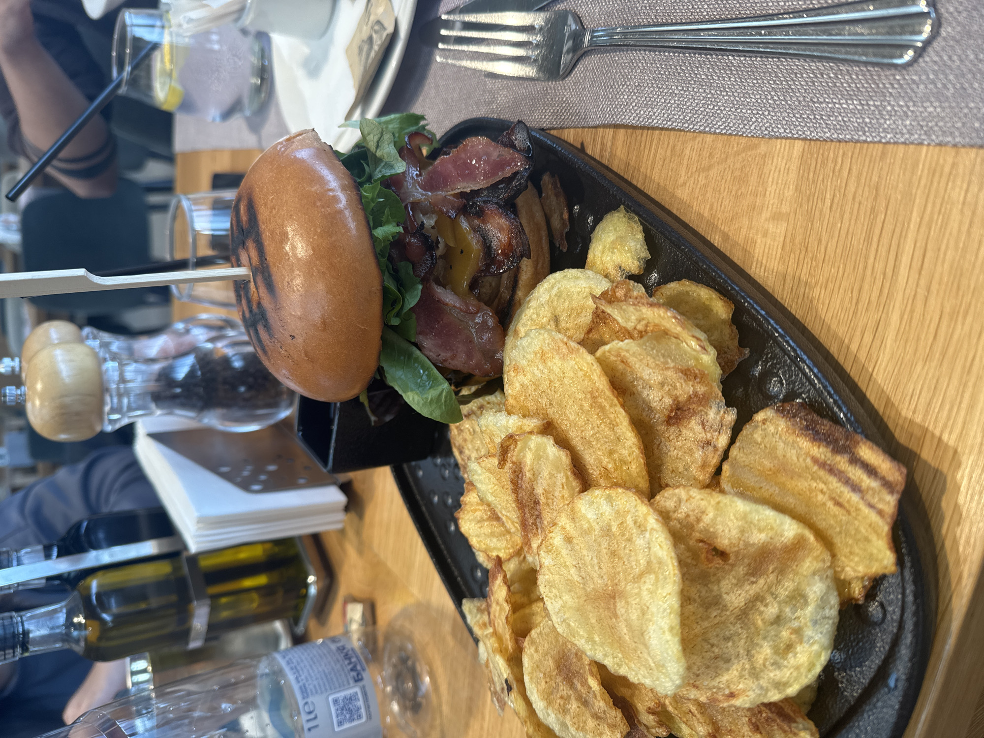 meal served on a wooden table. A burger on a skewer is positioned next to a black dish filled with potato chips, bacon and vegetables. Silver cutlery rests on a grey placemat at the top of the image. Salt, pepper, napkins, bottled water and a wine bottle are visible on the left of the frame. A glass with a lemon slice and a black straw is visible in the top left corner of the image. The image does not contain any information about the location in Chernovrah, Bulgaria.
