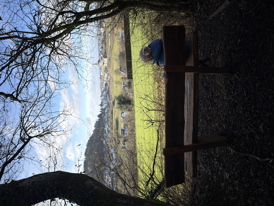 A wide-angle outdoor photograph depicts a child seated on a dark wooden bench, observing the cityscape of Pétange, Luxembourg, from an elevated vantage point. The child is viewed from behind, wearing a blue hooded jacket with a light-colored, possibly fur-lined, hood, and light hair. Their right hand rests on the bench's dark wooden backrest. The immediate foreground around the bench is shadowed and covered with dark leaf litter and debris. Beyond the bench, a vibrant green agricultural field is visible in the mid-ground, bordered by sparse, bare deciduous trees and shrubs. Some branches of these trees exhibit small yellow-green catkins. In the distant background, the town of Pétange spreads across a valley, featuring numerous residential and commercial buildings of various sizes and colors. A prominent church steeple with a dark, pointed roof is centrally visible within the distant townscape. The horizon is composed of rolling hills partially covered with trees, beneath a bright blue sky with scattered white cumulus clouds. The scene is illuminated by direct sunlight, creating high contrast between the shadowed foreground and the brightly lit mid-ground and background, with bare tree branches framing the upper and side portions of the image.
