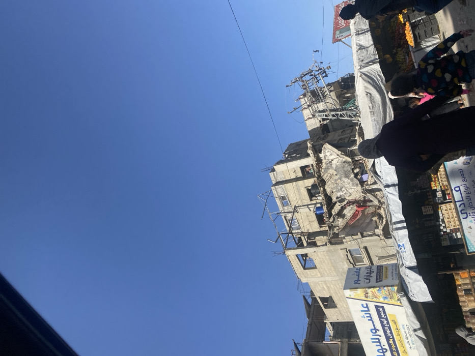 An outdoor scene in Khan Yunis, Palestinian Territory, is depicted under a clear blue sky
