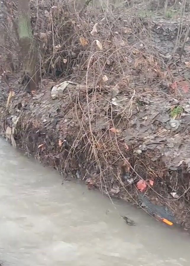 narrow, shallow stream flowing through a wooded area. The water is murky and a light grey color. The stream banks are lined with fallen leaves, bare bushes, and bare trees. Trash is visible along the banks, including pieces of plastic and other debris. The camera appears to be positioned slightly above the stream, looking downstream. The scene is quiet and undisturbed.