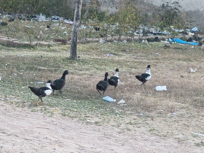 Five Muscovy ducks forage in a grassy, littered area. They are black with white markings on their heads and necks. The ground is a mix of dry grass and bare earth. Trash, including plastic and white debris, is scattered around. In the background, vegetation and more scattered trash are visible. A thin tree trunk stands upright amidst the scene. The composition suggests a rural or neglected environment.