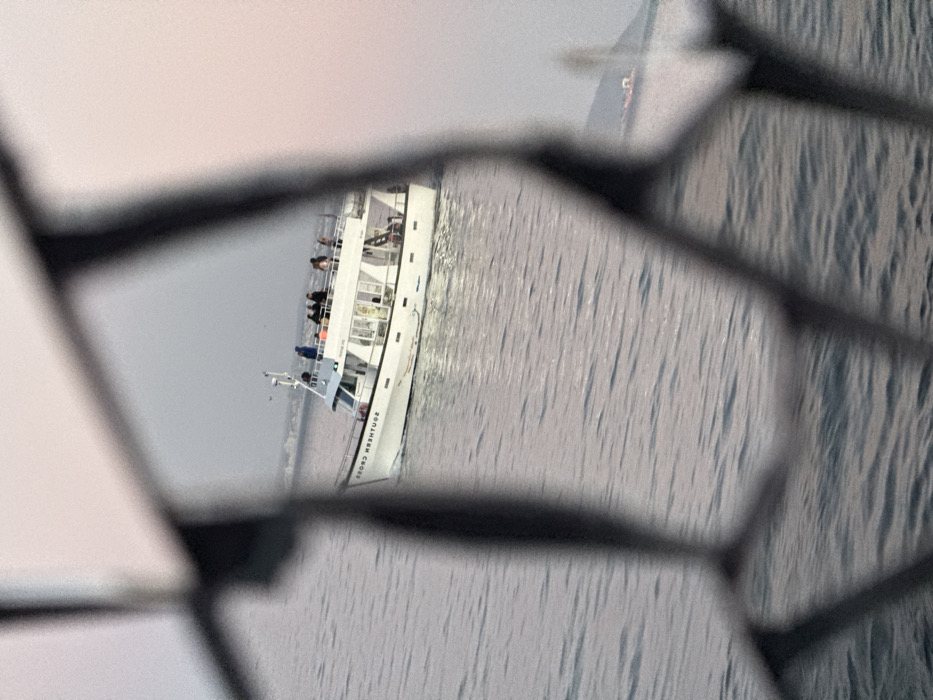 A white, two-tiered boat sits in a body of water, partially obscured by what appears to be a fragmented mirror or a broken frame. Passengers can be seen on both levels of the boat. The water's surface is rippled, and the sky is overcast. Part of the boat's name, "SOUTHERN CROSS", is visible on its side. The surrounding broken frame creates a mosaic-like effect around the boat.