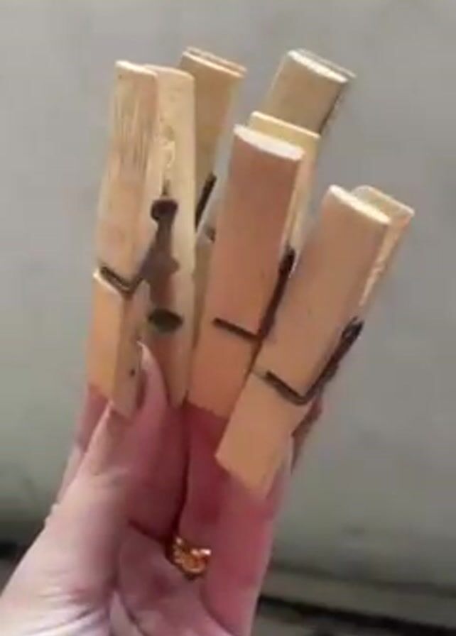 A hand holds five wooden clothespins, one attached to each finger. The clothespins are open and the hand shakes them, causing a rattling noise. The background is a plain, light-colored surface. The hand wears a gold ring.