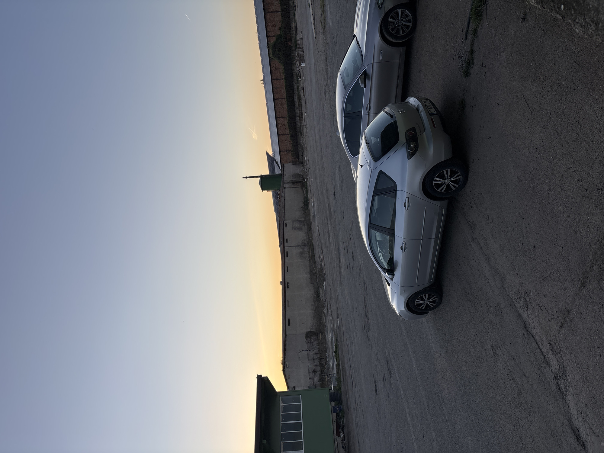 The image depicts two parked, light-colored cars on an asphalt surface. The first car is a hatchback, and the second appears to be a sedan. The background features industrial-looking buildings and a sunset sky with orange and blue hues. The image is taken in Kazanlak, Bulgaria.