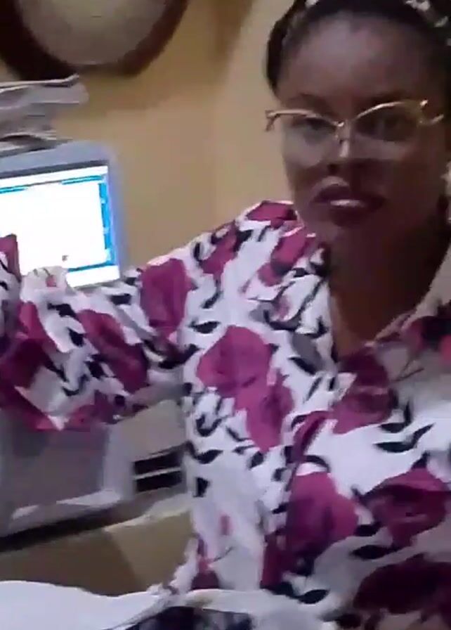 A woman wearing a white shirt with large pink floral patterns, a silver headband, and glasses is working at a desk. She is wearing disposable gloves on her hands. There is a computer monitor on the left side of the frame. In front of her on the desk are several small boxes, tubes, and what appears to be a phone. She is speaking. A round clock is visible on the wall behind her.