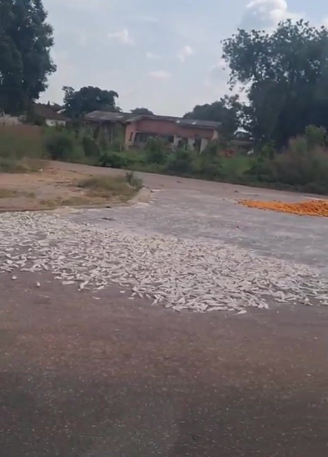 From a vehicle, the video shows a large asphalt area where food is being dried in the sun