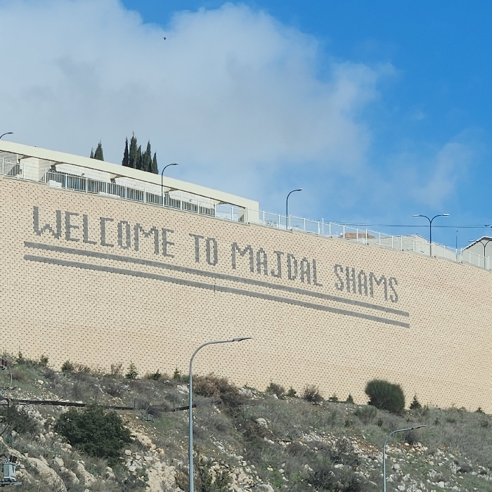 The image displays a large retaining wall on a hillside in Majdal Shams, Israel, under a partially cloudy blue sky