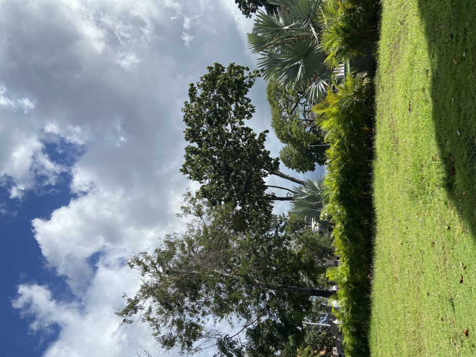 The image features a sky filled with cumulus clouds, some revealing patches of blue sky. A variety of trees are visible, including tall trees with dense foliage, some palm trees, and a row of meticulously trimmed shrubs. Bright green grass dominates the lower right of the frame. The angle suggests the photo was taken looking upwards.