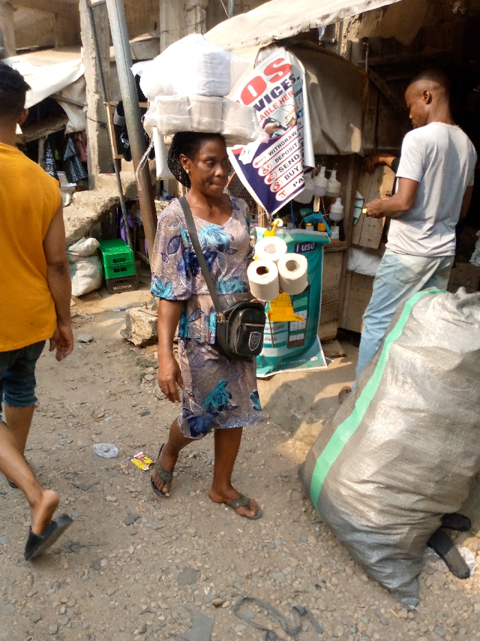 An African woman carries a load of goods on her head, along with a few rolls of toilet paper attached to her shoulder bag. She walks on a rough street in a bustling outdoor market. A man in a yellow shirt is walking beside her. Another man in a white shirt stands at a stall, while a large sack rests on the ground next to him.