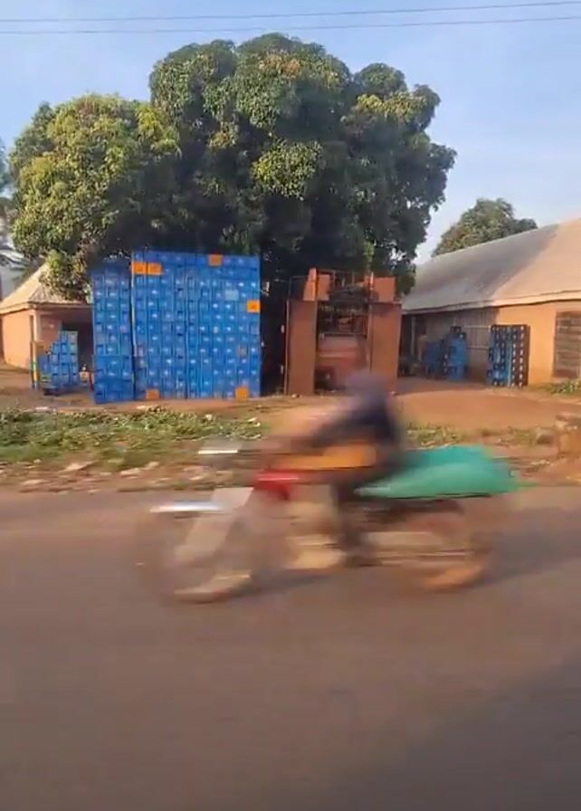 The video, shot from a moving vehicle, shows a roadside scene in what appears to be a rural or semi-rural area. Piles of blue plastic crates are stacked beside a large, leafy tree. Several basic, single-story buildings with metal roofs are visible in the background. Motorbikes pass on the road. Power lines are strung overhead. The overall impression is of a modest, possibly developing area with simple infrastructure.