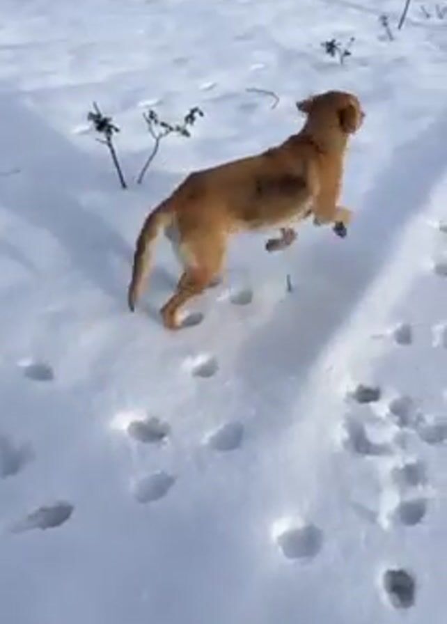 brown dog running in a snow-covered yard