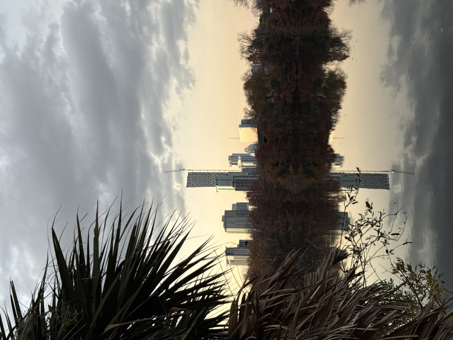 A sideways view reveals a cityscape reflected in a body of water. The sky above is overcast with varying shades of gray clouds. Silhouetted trees line the edge of the water, their branches bare or bearing autumn foliage. In the foreground, spiky palm fronds and other foliage frame the bottom of the image, adding a natural element to the urban scene. The reflection creates a symmetrical effect, blending the city's architecture with the natural landscape.