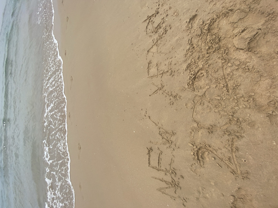A sandy beach scene features the ocean's edge with gentle waves lapping onto the shore. Footprints mark the sand near the water. Further inland, the names "Alex" and "Felix" are written in the sand, partially obscured by disturbed sand and footprints. The sand transitions from smooth to coarse, with some areas appearing darker and damp.