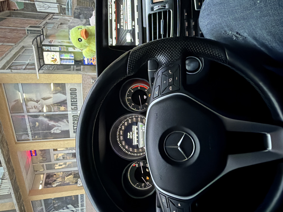 The scene is captured from inside a Mercedes-Benz vehicle, looking forward through the windshield at a commercial area in Rudozem, Bulgaria