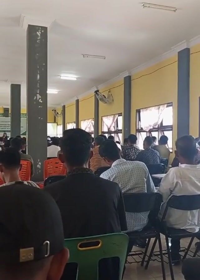 A video shows a room with many people seated in rows of chairs. The camera is behind a person wearing a black baseball cap. The room has yellow walls and several windows. There are columns in the middle of the room and ceiling fans. A banner is visible at the front of the room. The people are facing forward, seemingly listening to someone speaking.