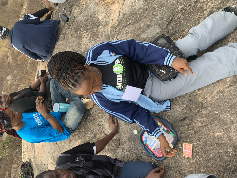 A group sits outdoors on a large rock surface. They are dressed in casual clothing. Some are seated, while others are reclined. A woman in a blue jacket and gray pants has a briefcase and a game board with cards nearby. Another woman in a blue shirt holds a water bottle. A few people are looking at or using their cell phones. One person is wearing a helmet.