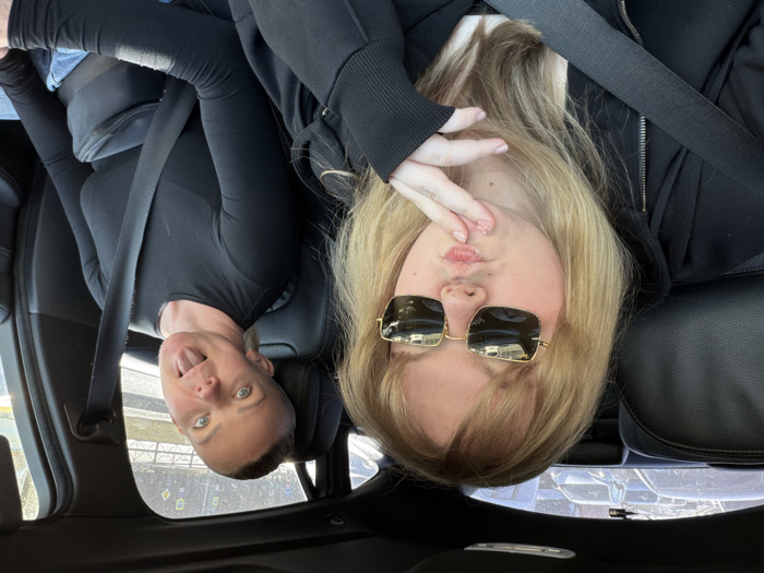 Two females are depicted inside a vehicle in Vsevolozhsk, Russia. The individual in the foreground, positioned left, has blonde hair, wears square gold-framed sunglasses, and a black zippered hoodie. She is making a "duck face" with puckered lips and her right hand resting near her chin, revealing manicured nails. A seatbelt is visible across her chest. The individual in the background, positioned right, has blonde hair pulled back, light-colored eyes, and wears a black long-sleeved top, blue jeans, and a black fanny pack across her torso. She is sticking her tongue out. A seatbelt is also visible across her. The vehicle's interior is dark. Through the windows, other vehicles, vegetation, and urban infrastructure, including a pole, are discernible under bright daylight conditions.
