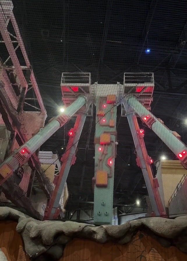 spinning ride in an indoor amusement park. The ride consists of a central structure with four arms supporting a large, circular platform with seats around its perimeter. The ride spins, causing the riders to turn upside down. Red and white lights illuminate the ride. The surrounding environment appears to be themed with structures resembling building facades and simulated rubble. Netting is visible above and around the ride, likely for safety purposes.