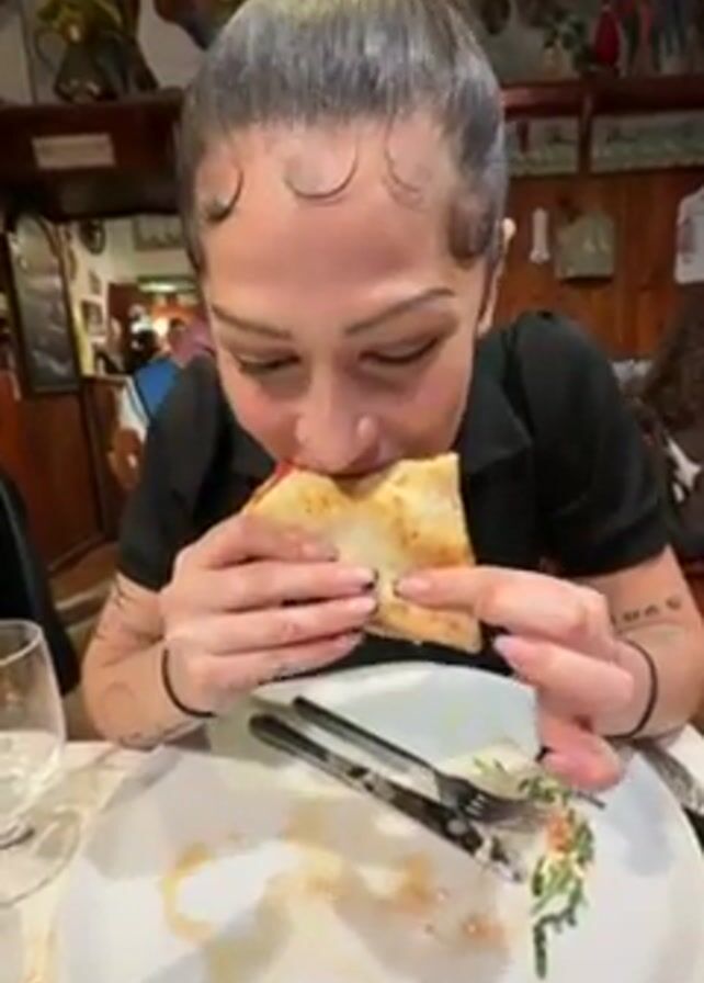A woman with her hair in a bun is sitting at a table and eating a sandwich. She's wearing a black shirt and has tattoos on her arms. The sandwich appears to have tomato and cheese. She's eating it with gusto, and the camera is close to her face. There is a mostly-empty plate, a fork, a knife, and a wine glass on the table. The background suggests a restaurant setting, with wooden walls, shelves, and other diners in the distance.