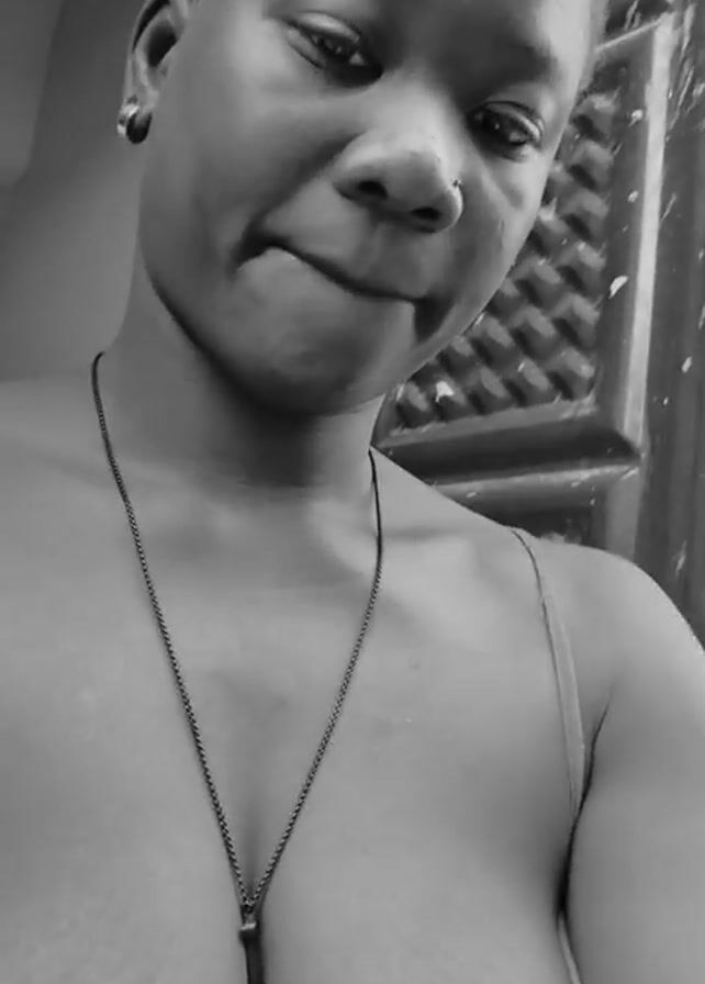 young woman in black and white. She has short hair and wears a tank top and a necklace with a dark pendant. She looks at the camera with a slightly pursed lip and a serious expression. She is standing in front of a textured door or wall, and there is a glimpse of a curtain or window in the background.