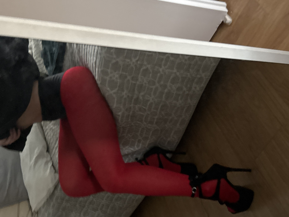 The image displays a person's lower torso and legs from the waist down, seated or reclining on a bed or sofa in an indoor setting. The specific location within Buenos Aires, Argentina, cannot be determined from the visual information provided. The subject is wearing bright red full-length hosiery and black high-heeled platform shoes featuring open toes and ankle straps. A dark-colored garment is partially visible on the upper torso, with a bare midriff exposed above the red hosiery, which appears to have a thick black waistband. The legs are crossed or positioned to the left. The background consists of a bed or sofa covered with a gray textile featuring a subtle geometric pattern. A white pillow is visible on the bed/sofa to the upper left. The floor is made of light brown wooden planks. On the right side of the frame, a segment of a white vertical mirror frame is prominent, indicating the image is a reflection captured in a mirror. A blurred white object, possibly furniture, is partially visible beyond the mirror frame on the far right.