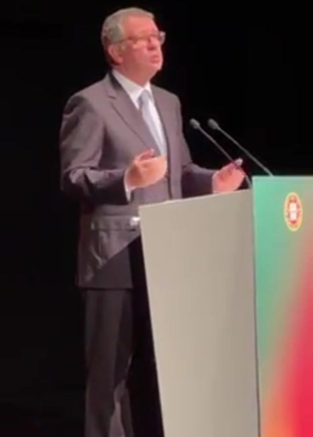 A middle-aged man in a dark suit stands behind a podium speaking. The podium has the Portuguese coat of arms on its right side, which is also decorated in green, yellow, and red. The man wears glasses, a light-colored collared shirt, and a light-colored tie. He is holding his hands in front of him on the podium. Two microphones stand in front of him on the podium. The man’s face and hands are visible. He has graying hair. The background is a dark stage. The man is speaking to an audience that is not visible in the video.