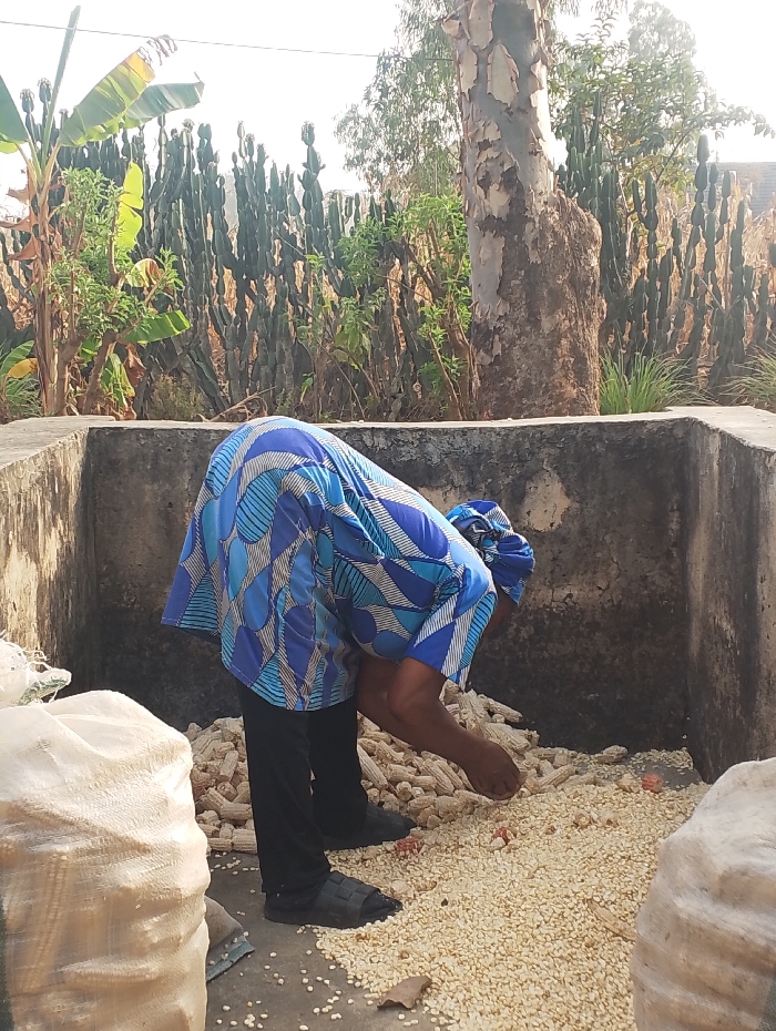 A person in a blue patterned shirt and black pants bends over a concrete enclosure filled with dried corn