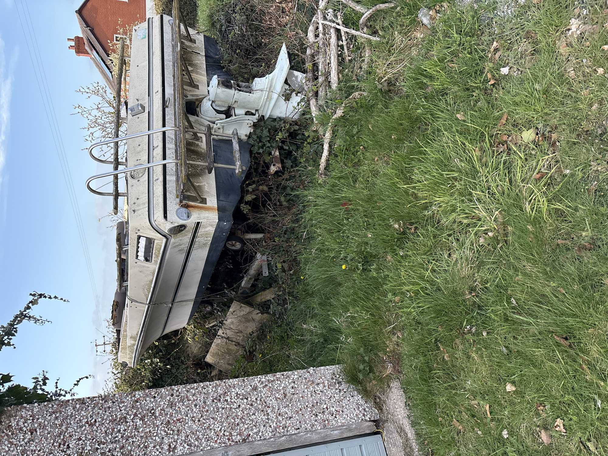 The image displays a derelict white and dark grey powerboat situated on overgrown land in Minsterley, United Kingdom, beneath a clear blue sky with sparse clouds. The boat, heavily stained with dirt, rust, and green biological growth, is elevated on an unseen support structure or trailer. Its bow faces left, revealing damaged interior upholstery, while its stern, featuring a weathered white outboard motor with a visible propeller, faces right. A rusted metal swimming ladder with wooden steps is affixed to the stern, alongside a small, square, metallic object mounted on the transom. To the left in the foreground, a pebbledash pillar or wall, constructed from small, multi-colored aggregate, stands partially visible. A grey panel, possibly a garage door, and a yellow electrical cable are at its base. The ground is covered with long, unkempt green grass, interspersed with dry leaves and occasional small yellow wildflowers. Dense green ivy and other scrub vegetation, along with discarded wooden debris and concrete slabs, surround and partially obscure the boat's lower hull. In the background, utility poles and power lines are visible against the sky. To the far right, a red brick house with a dark roof and white window frames is partially discernible. No individuals are present in the scene, and no actions or interactions are depicted, indicating an abandoned or disused state.