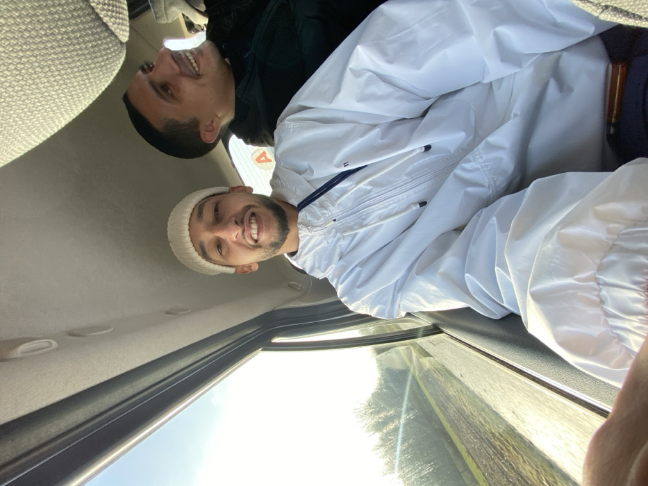 Two adult males are observed inside a moving vehicle, likely a passenger van or car, in La Wantzenau, France, during daylight hours under a clear sky. The primary subject, positioned in the foreground and facing the camera, is a male with a short dark beard and dark hair, wearing a light beige knit beanie and a white hooded anorak jacket. He is smiling broadly, exposing his teeth, and appears to be taking a selfie. His left arm is visible in the lower left corner. Behind him, to the right, a second male is partially visible. This individual also has short dark hair and is smiling while looking towards the right side of the vehicle, away from the camera. He is wearing a dark-colored jacket. The interior of the vehicle features a light-colored headliner. A large window on the left side of the vehicle reveals a bright, sunlit exterior. The landscape outside consists of a field, possibly tilled, next to what appears to be a road or path. Beyond the field, a line of deciduous trees or bushes with bare branches is visible against the bright sky. The blurred appearance of the exterior suggests the vehicle is in motion. A white circular sticker with a red 'A' is affixed to the window between the two individuals, commonly indicating a novice driver in France. A small, indistinct brown object is visible on the foreground subject's lap.
