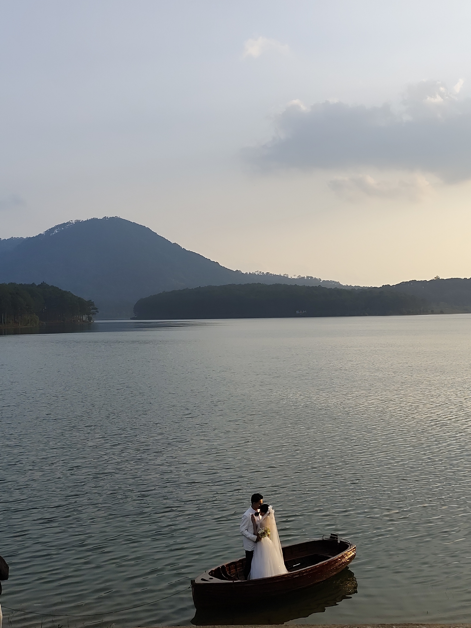 The image depicts a wedding couple in a small wooden boat on Tuyen Lam Lake, Da Lat, Vietnam, during conditions consistent with late afternoon or early evening. The sky occupies the upper half, displaying a gradient from light gray-blue at the zenith to pale yellow-orange near the horizon, with several diffuse gray clouds. In the background, dark, tree-covered mountain ranges are silhouetted against the sky, extending across the entire width of the frame, with sections appearing as islands or peninsulas within the lake. The main body of water, Tuyen Lam Lake, shows subtle ripples across its surface. In the foreground, a dark brown, presumably wooden, rowboat is positioned close to the left bank of the lake. A white rope extends from the bow of the boat towards the lower left corner, indicating it is tethered to the shore. Inside the boat, a man and a woman are standing in an embrace. The man wears a white suit jacket, dark trousers, and a dark bow tie. He is positioned facing the woman, with his left arm around her. The woman wears a white, floor-length wedding gown with a long veil extending down her back, and she holds a small bouquet of light-colored flowers. Their heads are close together, suggesting an intimate interaction such as a kiss or tender moment.