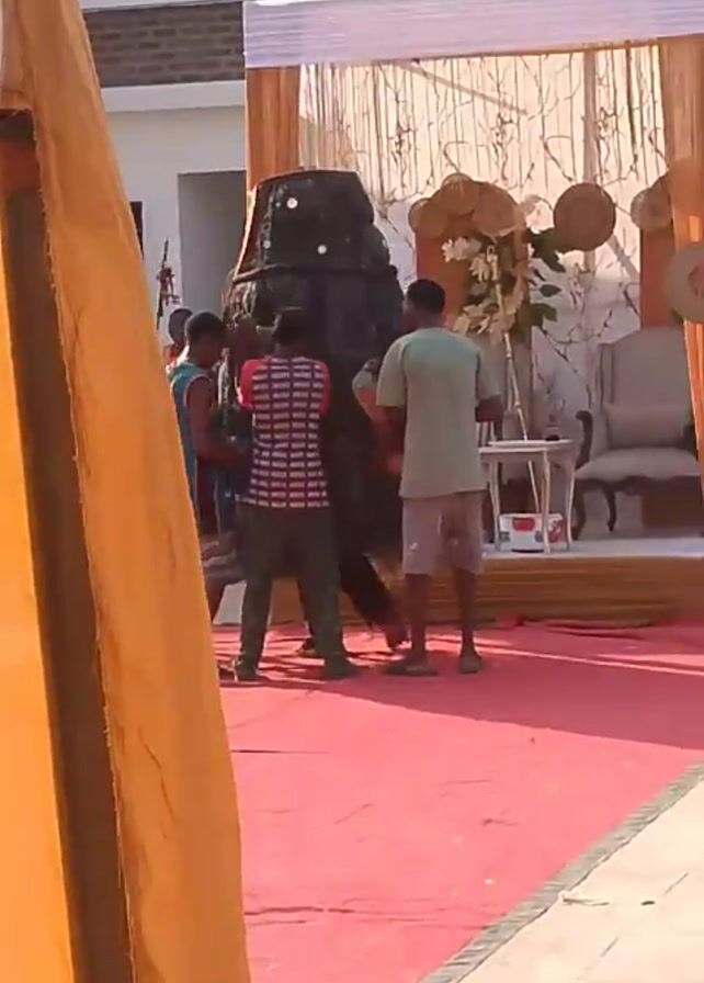 Several people move an object on a red carpet toward a decorated stage, partially obscured by a large, orange-yellow tent panel. The object, dark in color, appears to be a large decorative piece, possibly for a wedding or other event. Behind them is a building, with trees and sky visible above it. The men are dressed in casual clothing. The camera is positioned behind the tent panel, offering a partially obscured view of the scene. Loud music is audible.