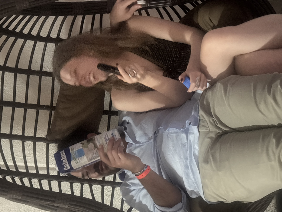 - "Two individuals, a male and a female, are seated closely within a dark brown wicker hanging chair, likely in an indoor or covered outdoor setting in Acapulco de Juárez, Mexico, suggested by the "Acapulco" label on a carton" by FM-vhRXA3, licensed under CC BY 4.0