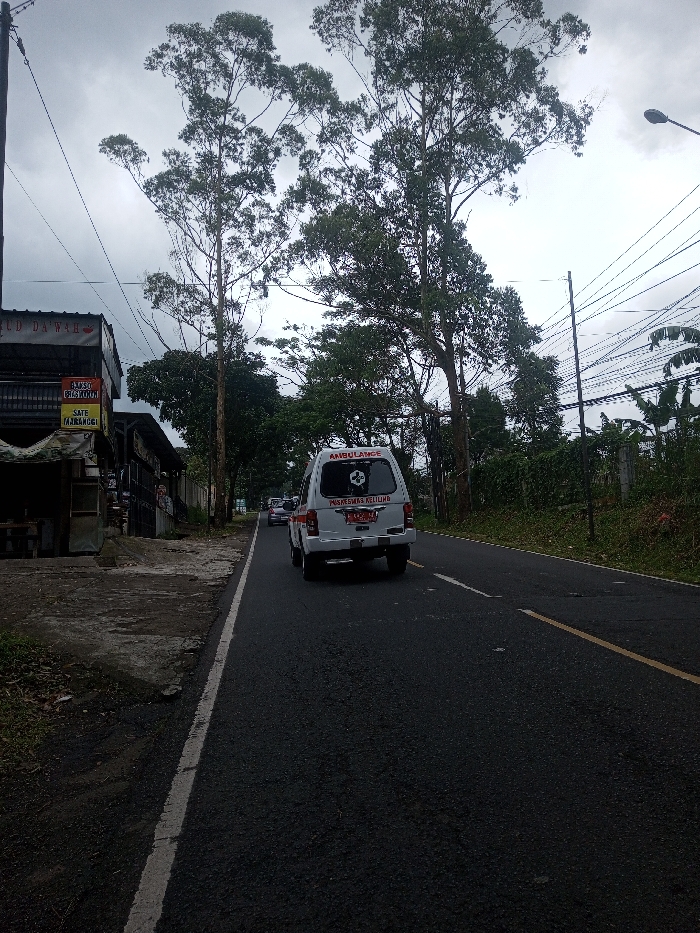 An ambulance travels on an asphalt road, bordered by a white painted line. A building is on the left side. Tall trees line both sides of the road. Power lines crisscross overhead against a cloudy sky. Lush greenery grows on the right side of the road. Other vehicles are seen in the distance.