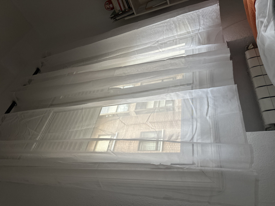 The image displays an interior room in Madrid, Spain, viewed looking directly toward a window. White sheer curtains, attached via black grommets to a dark rod, hang across the window. Through the translucent curtains, an exterior brick building with multiple rectangular windows is visible. The window itself features a partially lowered external roller blind (persiana). Below the window, a white, horizontally segmented radiator is mounted against a light-colored wall. To the right, a white bookshelf is partially visible, containing several books and a small red decorative item on its top shelf. The bottom right foreground shows a section of a bed with white bedding and an orange blanket or throw. No individuals are present. The scene is illuminated by natural daylight filtering through the curtains and window.