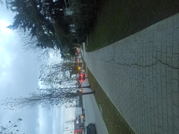 A cracked, brick-paved path extends along a road with sparse traffic. Trees and foliage line the path's edge. Streetlights illuminate the scene. Buildings are visible in the background. The sky is overcast and muted. The overall mood appears somber and possibly damp.