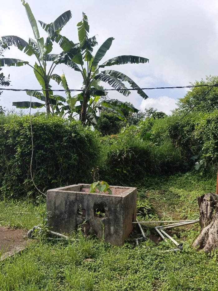 A concrete, square structure with a hole is surrounded by green foliage, grass, and some white pipes. A small plant grows inside the structure. Two banana trees stand tall in the background, along with lush green vegetation and trees. A power line stretches across the scene beneath a cloudy sky. A tree stump is visible to the right of the concrete structure.