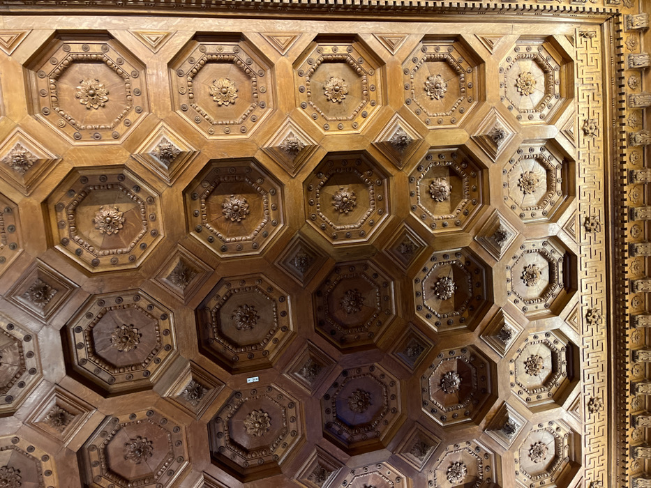 n intricately carved wooden ceiling. It features a repeating pattern of octagonal panels, each adorned with a floral emblem in the center and a ring of decorative circles. The octagons are separated by smaller, square panels with similar floral carvings. The wood has a rich, golden-brown hue, with shadows emphasizing the depth and detail of the carvings. The right edge displays more ornate, linear designs.
