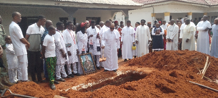 The scene depicts a solemn outdoor gathering, likely a burial ceremony, in an outdoor area of Aba, Nigeria. In the immediate foreground and midground, a rectangular grave has been dug into reddish-brown earth. Large mounds of the same reddish-brown soil are piled around the grave. To the right of the grave, a shovel and some wooden stakes are visible. Approximately 30-40 individuals, predominantly adults, are gathered around the grave. Many men are dressed in white traditional or clerical attire, including robes, stoles, and caps. A central figure, dressed in a full white robe and cape, stands at the head of the grave, holding a censer and another long, dark object, actively performing a ritual over the open grave. To the left of the grave, an individual holds a large, ornate framed portrait depicting a crowned figure. Other attendees wear a mix of white and patterned clothing, including one man in green patterned trousers and a white t-shirt. A woman in a dark dress over a white long-sleeved top holds a book. The individuals appear to be observing the ritual with solemn expressions. In the background, a building with a light-colored facade and a dark roof is visible, featuring windows and what appears to be a veranda or overhang. The sky above is bright, indicating daylight conditions.