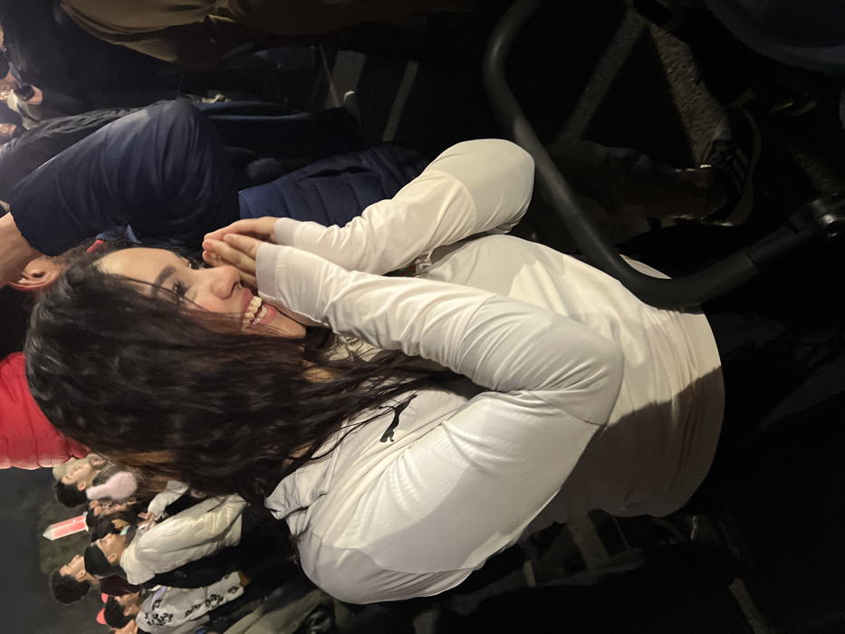 A smiling woman with dark hair, wearing a light-colored athletic jacket with a Puma logo, has her hands near her face. She's surrounded by other people seated in stadium-style seating. The lighting is dim. A black metal bar or railing is visible nearby, suggesting a public event. The overall composition indicates a candid moment captured in a crowded environment.