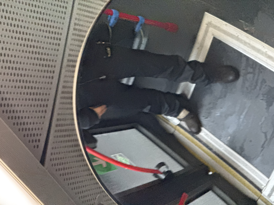 The scene, located in Orsay, France, depicts a distorted reflection, likely from a convex mirror or curved surface, showing the lower half of an individual and elements of an interior environment. The reflection captures the lower torso, legs, and feet of one person, wearing dark trousers and dark brown shoes. A light-colored cuff or sock is visible above the individual's right shoe. A dark object, possibly a utility clip or holster, is attached to the person's left hip, from which a lanyard or cord extends. The individual stands on a grey, mottled floor marked with a white rectangular outline. To the reflection's left, a black door frame is visible. Adjacent to this frame, a red, curved handle or safety bar with a black base is present, and a partial green symbol, resembling a downward arrow or an exit sign, is discernible on a grey background. A yellow line runs along the floor parallel to the door frame. To the reflection's right, a red cylindrical object is positioned vertically, secured by two blue straps. Above the curved top edge of the reflection, a light grey, perforated metallic surface is visible, angled diagonally, consistent with a ceiling or wall panel in a public transit setting.