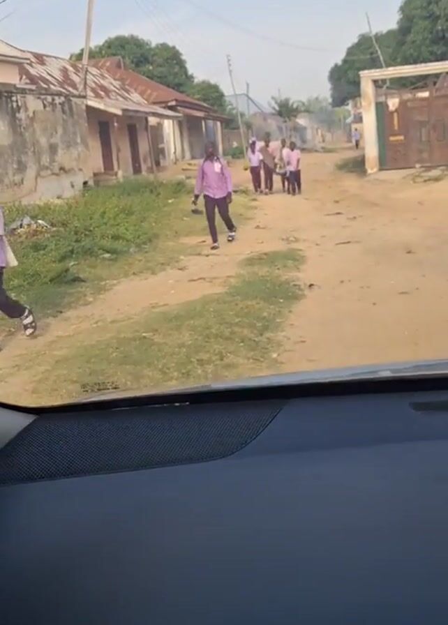A driver is traveling along a dirt road in a rural village. A small group of people are walking toward the camera. The people are wearing pink shirts and dark pants and appear to be dressed for school. The road is unpaved and there is grass and foliage along the sides. Several houses with simple, weathered exteriors can be seen. Power lines are visible overhead. The weather is clear and sunny.