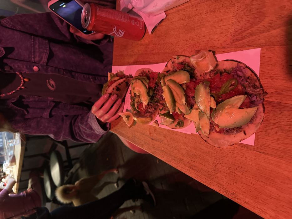 The image depicts an indoor dining scene at a bar or restaurant in Tel Aviv, Israel, characterized by prominent reddish-orange ambient lighting. On a wooden table, four prepared tacos are arranged on white paper, each featuring a base of meat, a vibrant red salsa or pico de gallo, and multiple substantial slices of avocado. Several lime wedges accompany the tacos. A person is seated at the table, partially visible, wearing a faded denim-style jacket over a dark t-shirt with a circular "G" logo, and a multi-beaded necklace. Their left hand grasps one of the tacos. Their right hand holds a white smartphone, which displays an illuminated screen showing a camera interface. A red Coca-Cola can with Korean text is situated next to the smartphone on the table. In the left background, the lower left leg and foot, clad in a dark shoe with a white sole, of another standing person are visible. Further in the background, a person with their back to the viewer, wearing a pinkish-red shirt, is seated at a bar counter with dark stools. A light-brown, fluffy dog stands on the dark floor in the background.