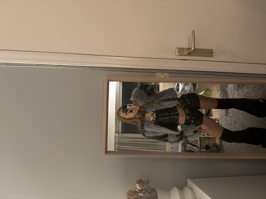 A female individual captures a mirror selfie in an indoor setting within the city of Paris, France. The subject is seen from the chest down, holding a smartphone that obscures her face. She is dressed in a black leather-look jacket with gray faux fur trim on the collar, cuffs, and front, accented with studs on the shoulders. Beneath the jacket, she wears a leopard print top layered with a black laced corset-style top, paired with black studded shorts, black knee-high legwear, and black platform boots. A black choker necklace is visible around her neck. She stands before a rectangular mirror with a light wood frame, positioned against a gray wall. To the left of the mirror, a white tiered vase holds dried flowers on a white surface. To the right, a light-colored door with a brass-toned handle is partially visible. The mirror's reflection reveals a room with a window, vertical blinds, shelving units containing various items, and a plant on the floor.