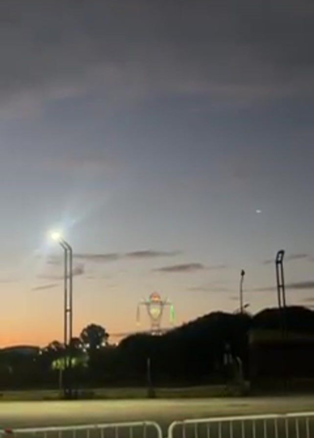 power line tower decorated with lights, creating the appearance of a robot-like figure. The tower stands behind a row of trees on a slight hill, with a sunset in the background. A street light illuminates a parking area with a white metal fence in the foreground. The sky is filled with soft clouds, and the light is dim. There are no people visible in the video.
