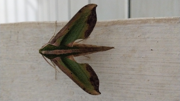 - "A full-frame photograph depicts an Oleander Hawk-moth (Daphnis nerii) resting vertically on a light-gray, textured surface, consistent with painted wood or concrete, in Lhoksukon, Indonesia" by FM-t5Tl43, licensed under CC BY 4.0