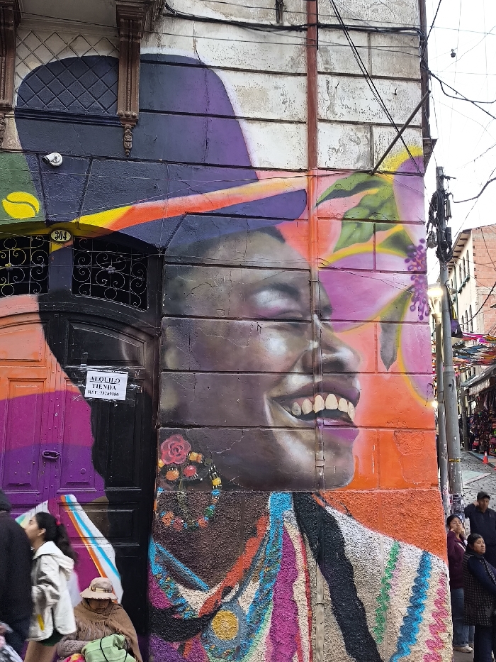 A colorful mural adorns the corner of a building with a black door. The mural depicts a smiling woman with a headdress and a flower earring, rendered in vivid shades of purple, orange, and pink. The adjacent door is painted with a gradient of orange and purple. People walk past the mural on a street lined with buildings. A sign is on the door.