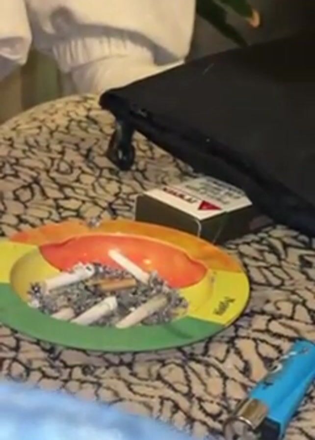 A person is working on their homework, with a pack of cigarettes, lighter, and ashtray nearby. The person speaks in Hebrew, holding up a sheet of paper.