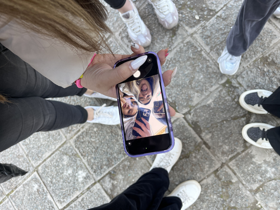 The image displays a top-down view of at least four individuals standing on a paved outdoor surface in Cherven Bryag, Bulgaria. The ground consists of irregular grey stone or concrete pavers. A right hand, featuring long, white acrylic nails (some with designs) and pink and yellow bracelets, holds a purple-cased iPhone horizontally in the center. The iPhone's screen shows a reflection or selfie of three young women's faces. The reflection on the left depicts a woman with dark hair holding another iPhone. The reflection on the right shows a woman with lighter hair smiling with her tongue slightly extended. A third face is partially visible below the left reflection. The lower sections of the individuals' bodies are visible around the phone. Footwear includes various white athletic shoes, some with dark or pink accents, paired with black or dark-colored pants.