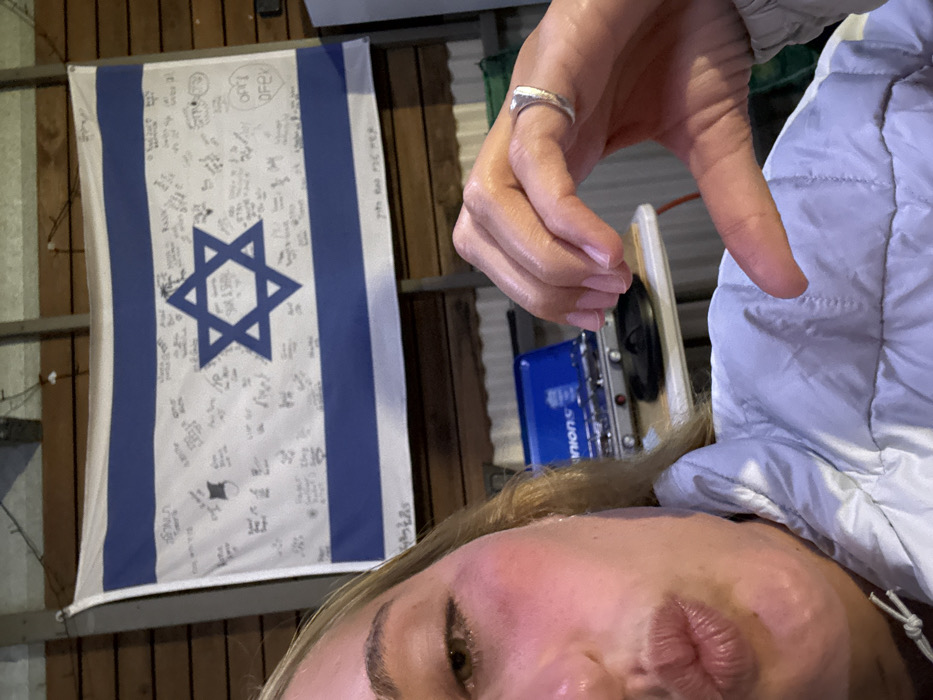 A female subject is partially depicted in a close-up selfie-style image, reportedly taken in Chadwick, Australia. The subject's right eye, nose, and pursed lips are visible on the left, while her right hand, adorned with a silver ring on the ring finger, is extended on the right, forming a partial heart gesture. She wears a light-colored, possibly grey, puffy jacket. In the background, a white Israeli flag with blue stripes and a central Star of David hangs against a wooden plank wall. The flag is covered in handwritten messages and signatures, some in Hebrew, some in English, including "SHIR & SHL" within the star and "OPF OPEX" on the right. Below the flag, a blue portable 'Union' brand two-burner gas stove is visible on a light surface, with a black circular object resting on one burner.