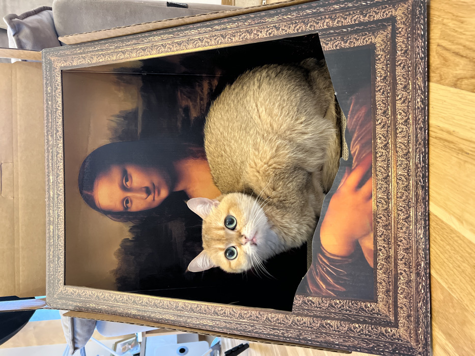 A golden-furred cat with striking green eyes is nestled within a makeshift frame featuring a print of the Mona Lisa